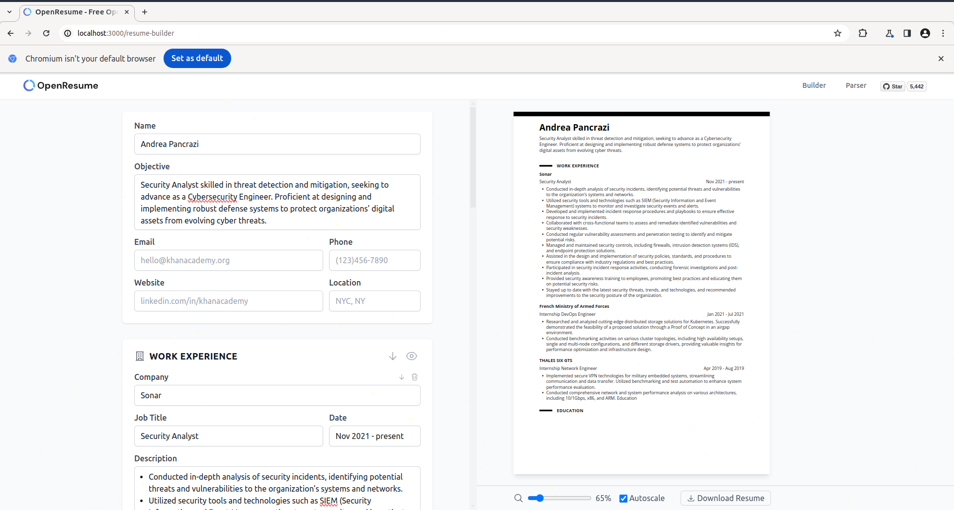 OpenResume is a more lightweight resume builder than the previous one. You can also use the online version or run it with its docker version: