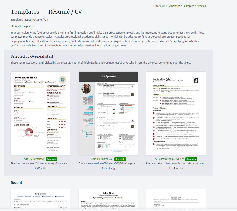 On Overleaf you have plenty of CV/Resume templates available (https://www.overleaf.com/latex/templates/tagged/cv):