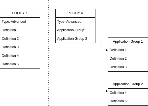 Advanced Policies can use both definitions or application groups, application groups are optional. Applications Groups allow an easier management of definitions and can be re-used in different policies instead duplicating and editing existing policies.