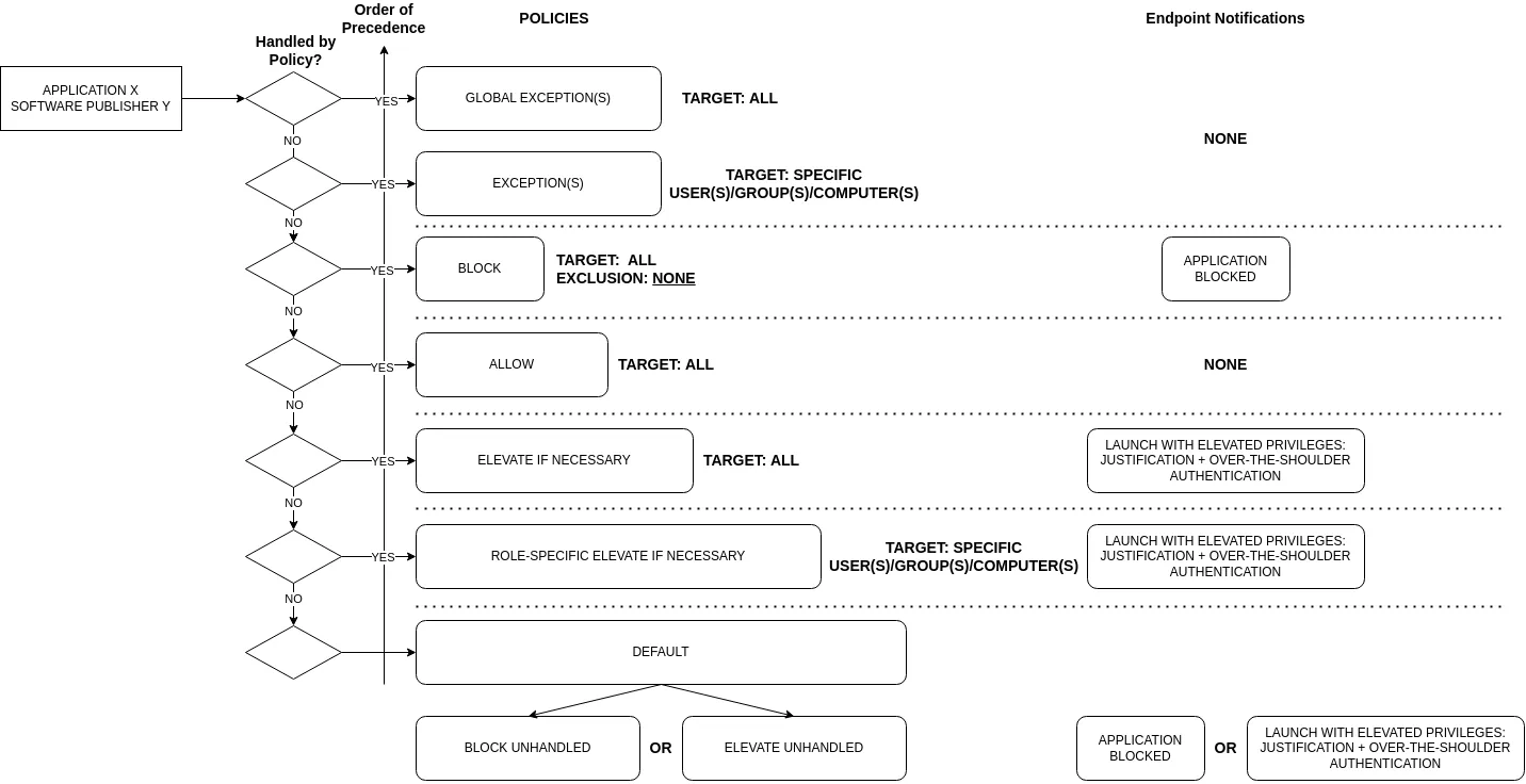 - Highest Priority Exceptions: Individual exceptions should have the highest priority. These exceptions allow specific software for specific users/groups/computers that would otherwise be blocked on all endpoints.