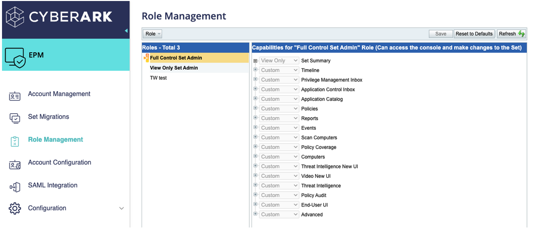 Once the SAML authentication is set up, the next step is to implement role-based access control within the EPM admin console. In the screenshot below, you’ll see how you can configure various roles with distinct sets of permissions. For instance, you might have roles designated for system administrators, helpdesk personnel, and security auditors.