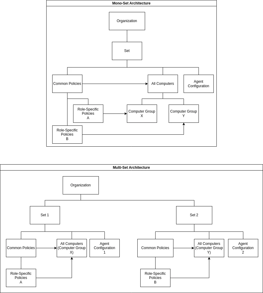 A mono-set architecture centralizes policies and agent configurations, simplifying management. This setup is particularly effective if you can integrate with Active Directory, as it allows for streamlined policy application across the organization.