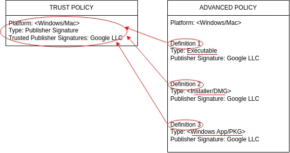 On one hand, Trust Policies are usually used to cover all applications from a Software Vendor (Microsoft, Google, etc) no matter the file type (executable, installer, DMG, etc) and are applied to all the computers within the set (no selection is possible) with the lowest priority.