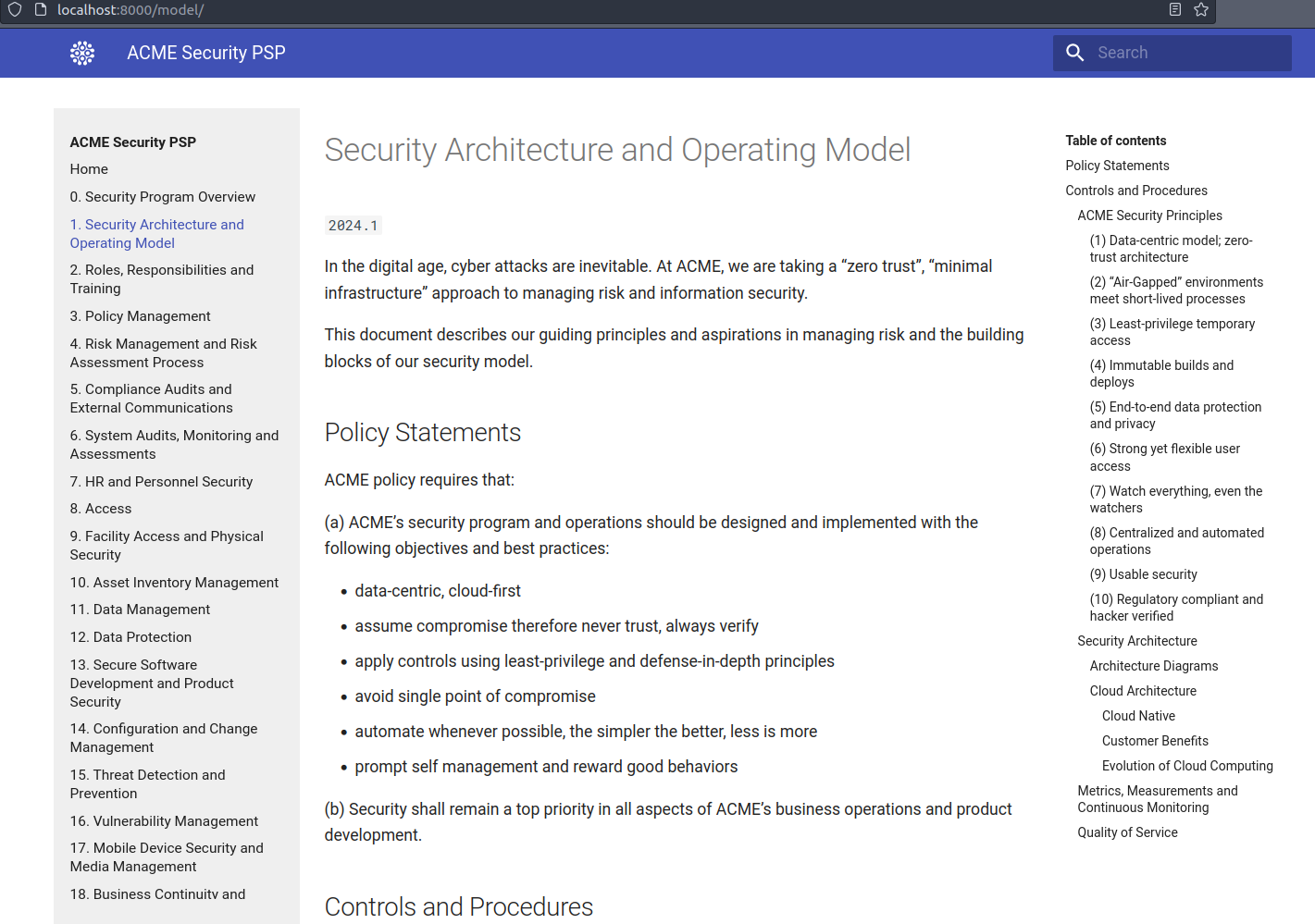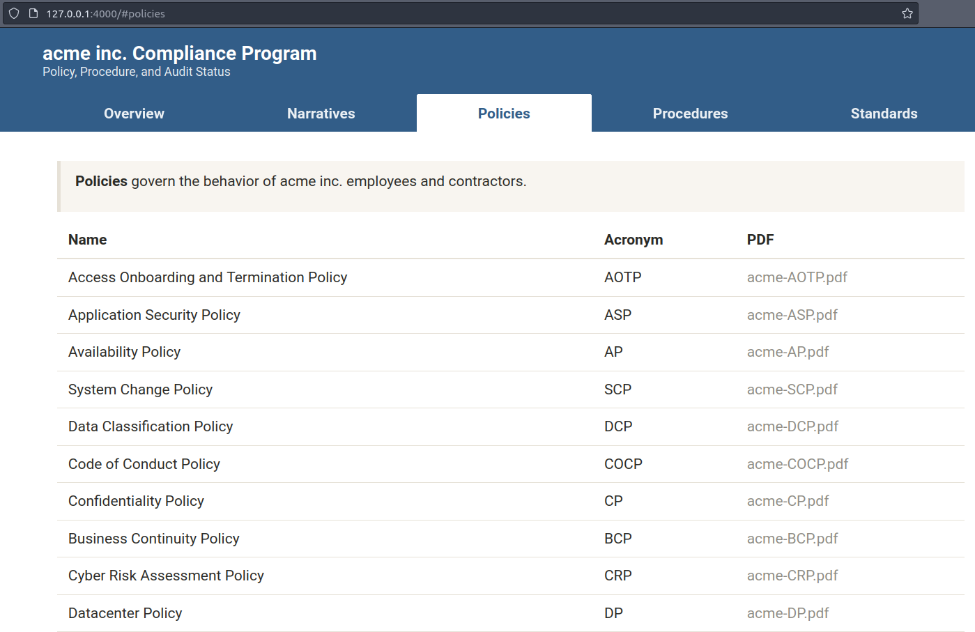 Policies can be easily edited in Markdown and are converted into LaTeX documents and served as PDF under the hood with pandoc.